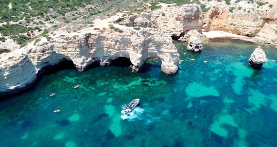 Prepárese para disfrutar de un recorrido en barco privado por la costa del Algarve guiado por un patrón profesional, solo para usted y sus seres queridos.Saliendo de Carvoeiro, disfrutará de las vistas de la costa y, en su camino, explorará playas escondidas como Praia do Carvoeiro, Vale de Covo y Carvalho. No pierdas la oportunidad de entrar a la gruta de Benagil solo accesible por agua y admirar esta formación única. Durante el recorrido, también verá la playa de Corredoura, así como la Praia da Marinha caracterizada por sus arcos rocosos.